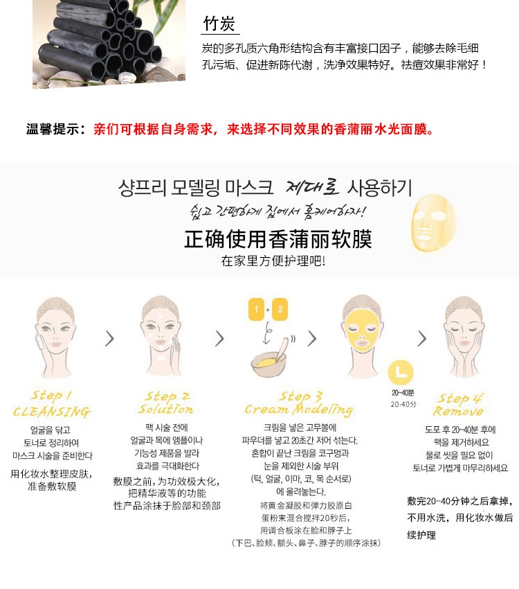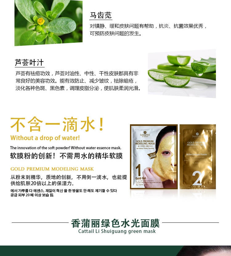商品介绍:香蒲丽水光面膜是亲和肌肤的原料配方,在专业美容SPA会所单独集中护理使用的~护理效果有效调节肌肤均衡,去除老废物,护理毛孔,镇定保湿!完全断绝外部的空气,帮助营养保湿成分进入肌肤深层,令肌肤湿润、柔滑的作用~卓越的保湿力,超强的紧致力,卓越的降温效果和弹性~维持弱酸性,提高导入精华效果,令肌肤维持最佳状态!适当的凝固时间,令初步者也简单方便的使用,不需要用水。方便的去除,也只要卸下面膜,几乎无残留,节约时间