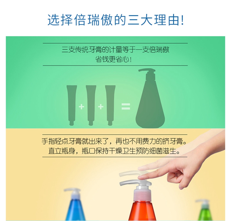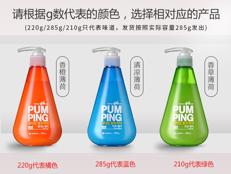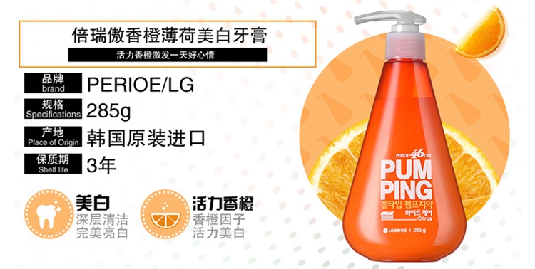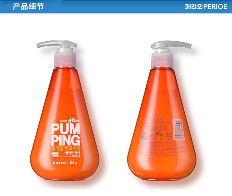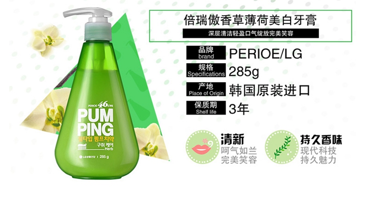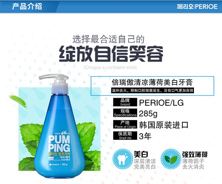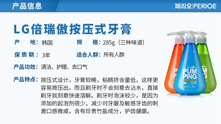 宋仲基代言 韩国进口LG牙膏倍瑞傲按压式液体牙膏285g
