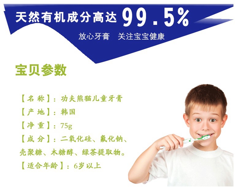 韩国进口功夫熊猫儿童牙膏 宝宝水果味防蛀牙牙膏 6-12岁宝宝75g
