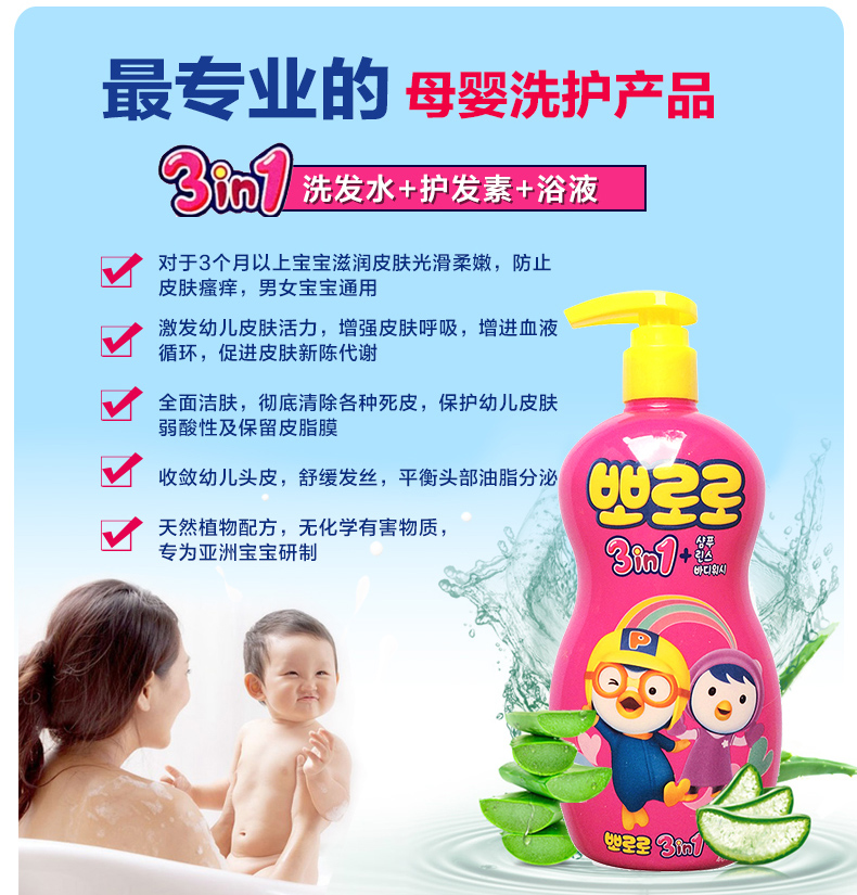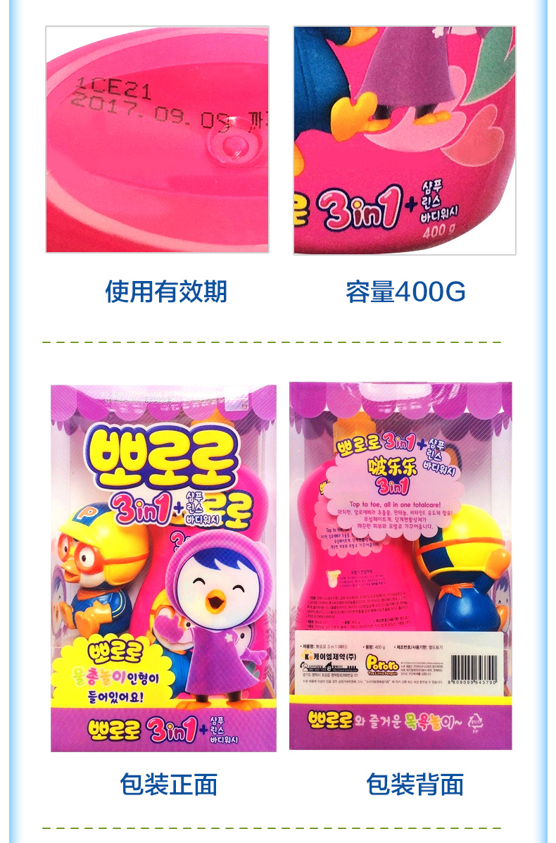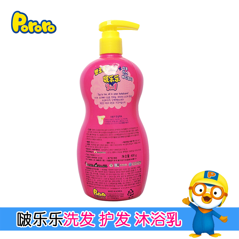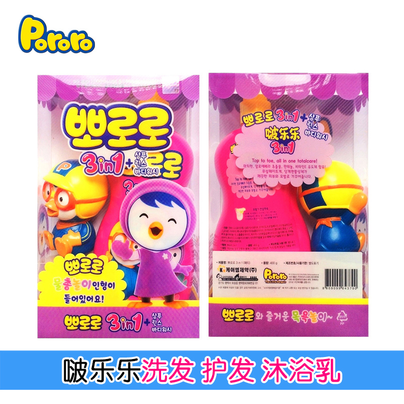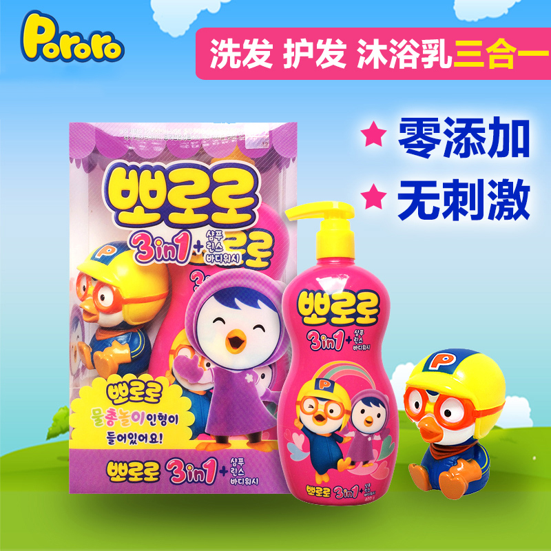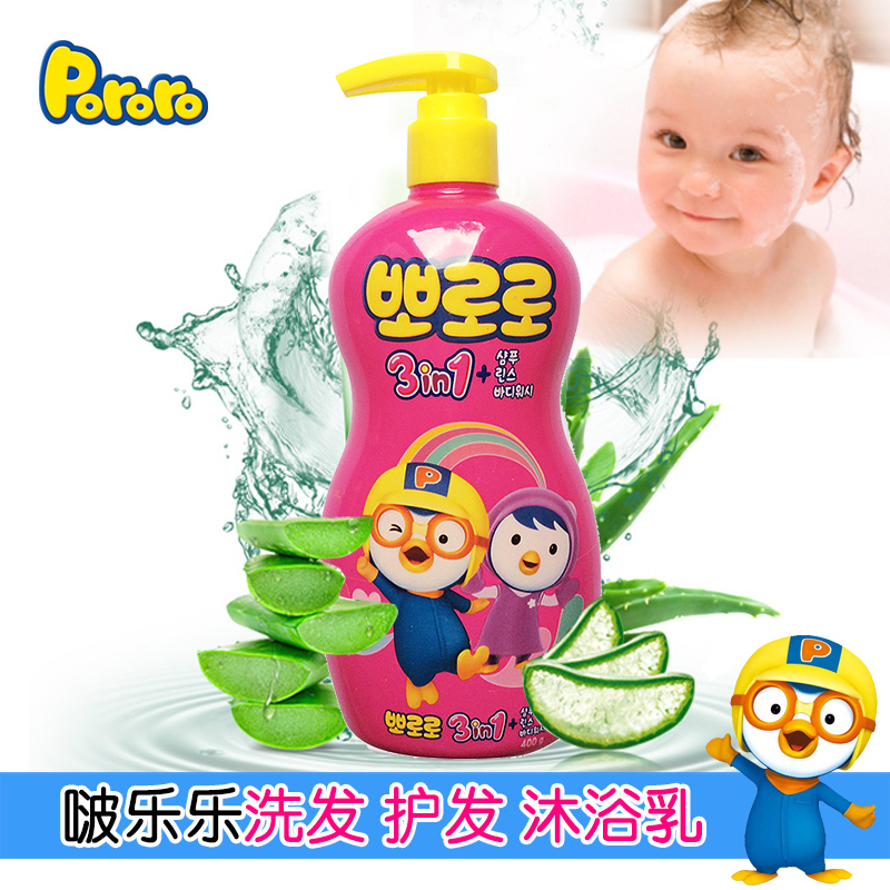 韩国进口PORORO宝露露 宝宝儿童洁面洗发水沐浴护发三合一送捏捏水枪