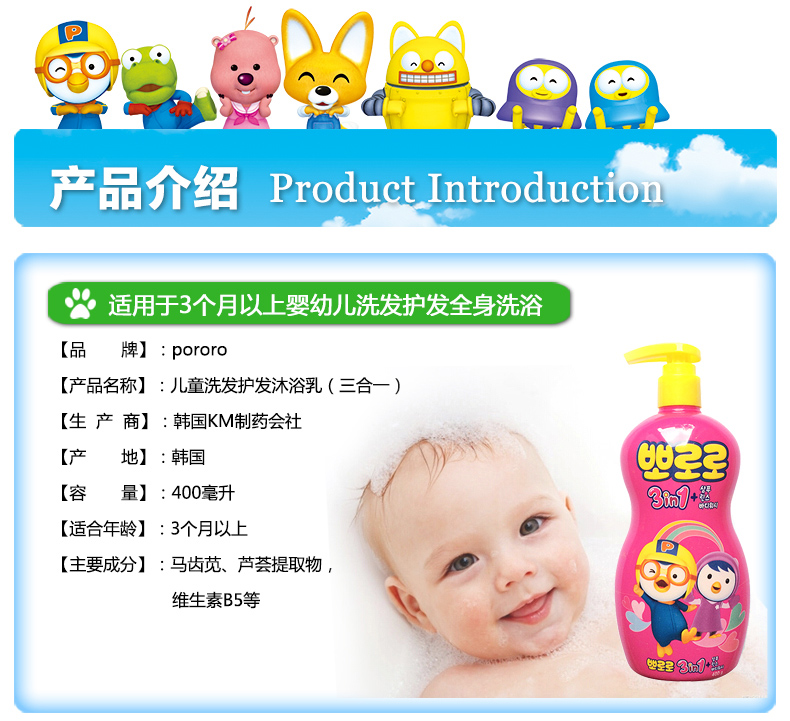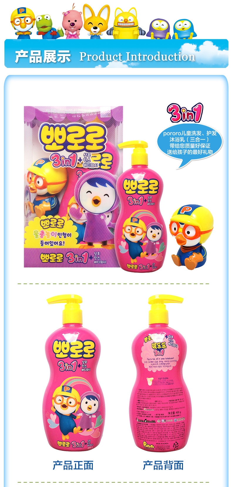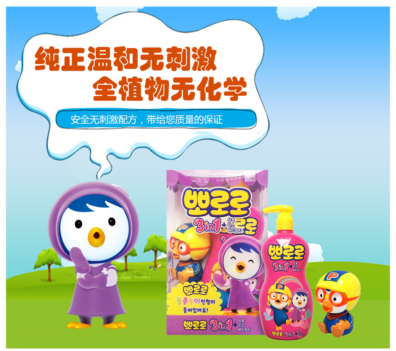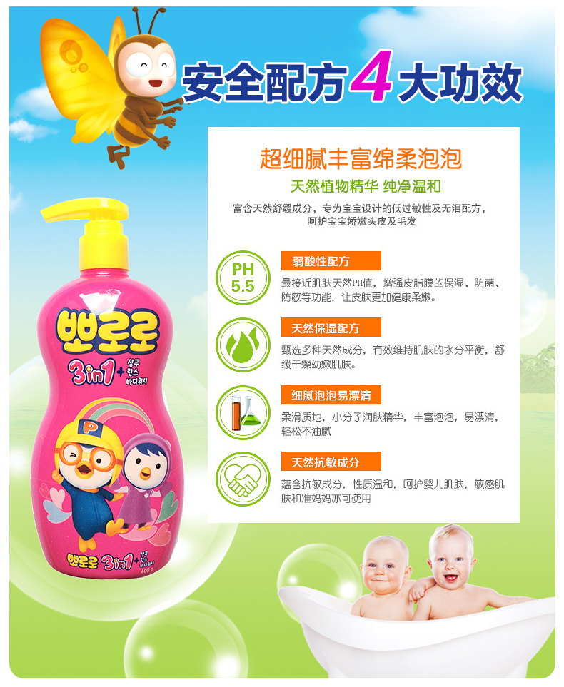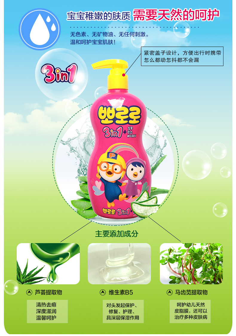 韩国进口PORORO宝露露 宝宝儿童洁面洗发水沐浴护发三合一送捏捏水枪