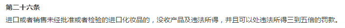 “违反本条例规定,进口或者销售未经批准或者检验的进口化妆品的,没收产品及违法所得,并且可以处违法所得三到五倍的罚款。”