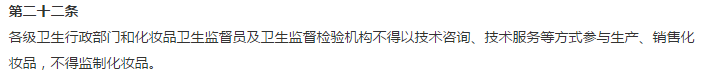 “各级化妆品监督管理部门和化妆品卫生监督员不得以技术咨询、技术服务等方式参与生产、销售化妆品,不得监制化妆品。”