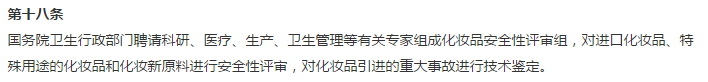 “国务院化妆品监督管理部门聘请科研、医疗、生产、卫生管理等有关专家组成化妆品安全性评审组,对特殊用途的化妆品和化妆品新原料进行安全性评审,对化妆品引起的重大事故进行技术鉴定。”